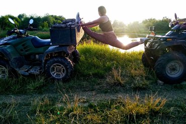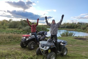 Катание идёт в индивидуальном формате — только вы и инструктор впереди. Катания на квадроциклах проходят индивидуально, без сборных составов. Можно на одном квадроцикле вдвоём или на двух: скорость настраивают под свой темп, от спокойной романтики до бодрой «грязи» и смеха под визором. Перед стартом короткий инструктаж, чтобы езда на мотовездеходах становилась понятной уже с первых минут. Права не нужны, обучение — на месте, экипировка выдаётся: шлем, очки, перчатки, наколенники. Дорога — не круг по полю, а реальные тропы вдоль реки Иж: поля, лесные коридоры, овраги и заброшенные мосты для атмосферных снимков. Это напоминает небольшие туры на внедорожниках по полям, лощинам и заброшенным мостам, где по‑настоящему безопасно и просто даже для тех, кто впервые, а ощущается как маленькое совместное приключение, где вы — команда.